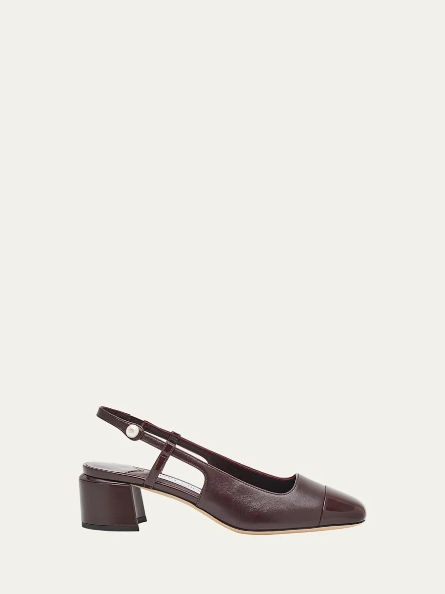 Jimmy Choo "Elisa" pumps in matte and patent calf leather 1.75 in / 45 mm block heel Round cap toe Pearly button slingback strap Leather/Rubber outsole Lining: Leather Made in Italy Size Note: Jimmy Choo runs small. We suggest that you order a half size larger than you typically wear. Online Inquiries: BGS21_X6XSH| Store Inquiries: #5043124