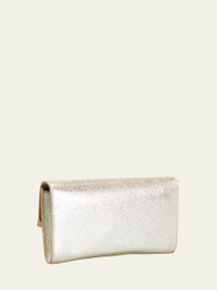 Jimmy Choo "Emmie" clutch bag in dusty glitter and leather. Removable chain shoulder strap. Flap top with snap closure. Asymmetric logo-engraved metal bar at front. Interior, leather lining; one zip pocket. Six card slots. 4.7"H x 8.7"W x 1.2"D. Made in Italy. Online Inquiries: BGS21_V3X0E| Store Inquiries: #2618444