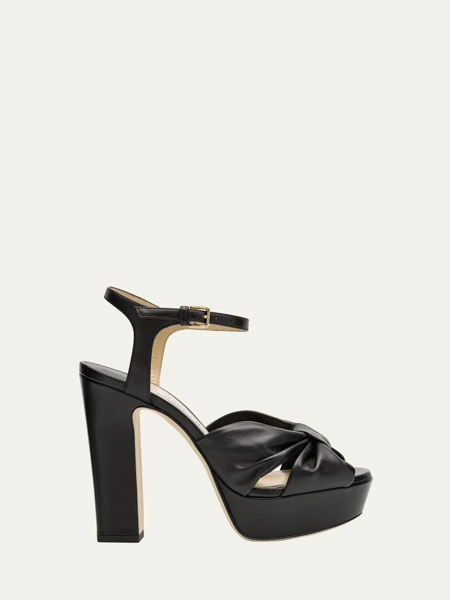 Jimmy Choo "Heloise" leather platform sandals 4.75 in / 120 mm covered block heel Open toe Knotted crisscross vamp Adjustable ankle strap Smooth sole Leather lining and outsole Made in Italy Online Inquiries: BGS21_X6XN8| Store Inquiries: #5040741