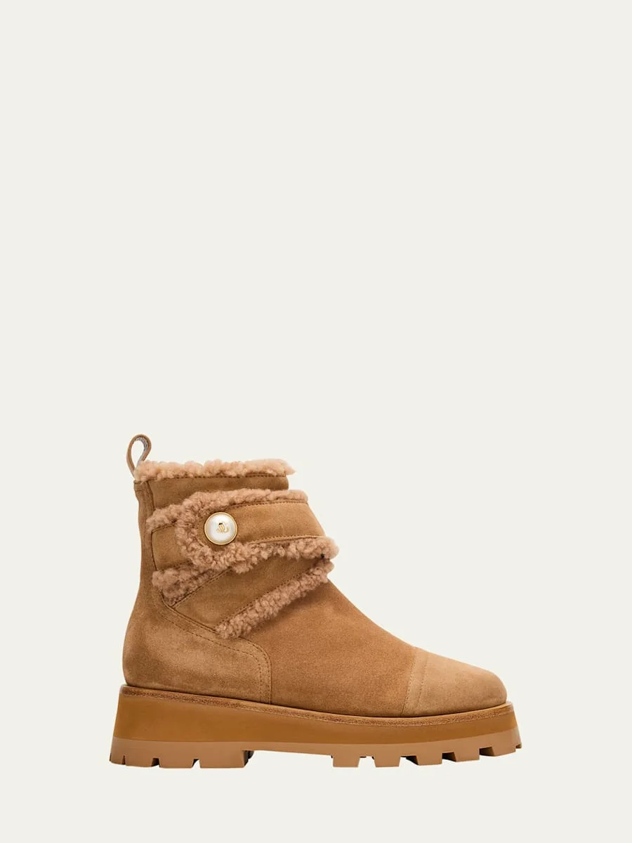 Jimmy Choo boots in supple suede highlighted with dyed sheep shearling (Greece) lining and trim Flat chunky heel Round cap toe Side zip eases dress Snap fastening strap with Monogram button Backstay pull tab Lugged outsole Contains real fur Made in Italy Online Inquiries: BGS21_X6ZJZ| Store Inquiries: #5071889