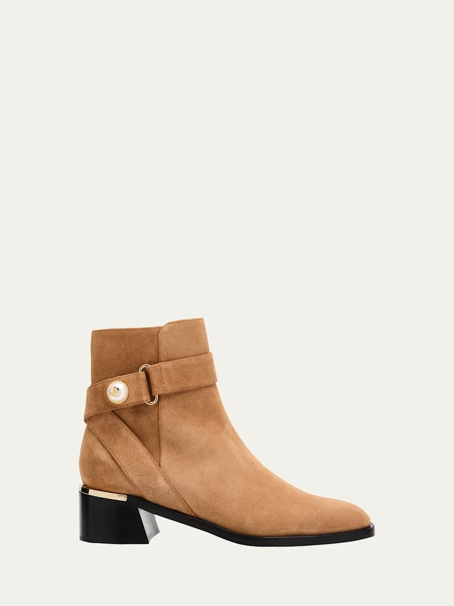 Jimmy Choo "Noor" suede ankle boots Wraparound ankle strap with logo-engraved pearly button 1.75 in / 45 mm block heel with metallic inset Round toe Side zip eases dress Made in Italy Online Inquiries: BGS21_X6XB2| Store Inquiries: #5034325