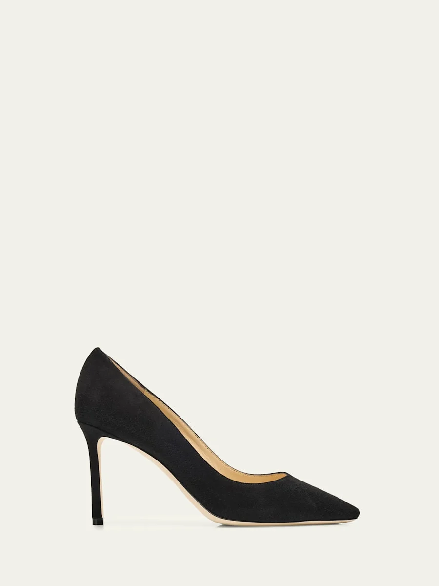 The classic pump is subtly updated with a softer pointed toe and modern stiletto heel, by way of the Romy style. This black suede pair is appealingly versatile, with a leather lining and sole that ensures durable wear. Let them lend a note of sophistication to any look you choose. Jimmy Choo suede pumps. 3.3" covered heel. Pointed toe. Slip-on style. Leather lining and sole. "Romy" is made in Italy. Size Note: Jimmy Choo runs small. We suggest that you order a half size larger than you typically wear. Online Inquiries: BGS21_X7DDP| Store Inquiries: #1815475