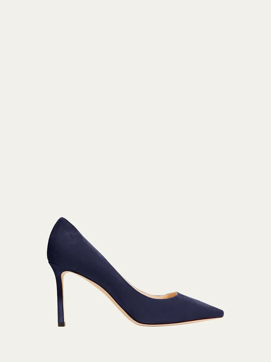 Jimmy Choo suede pumps. 3.3" covered heel. Pointed toe. Slipon style. Leather lining and sole. "Romy" is made in Italy.