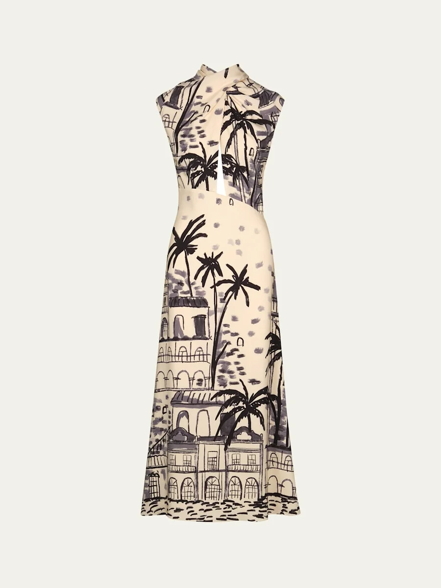 Crafted from lustrous satin, the "Interdimensional" dress from Johanna Ortiz features a signature landscape print and a crisscross neckline, creating a small keyhole waist cutout Crisscross halter neckline; selftie back Capsleeves Aline silhouette Full length Invisible back zip Silk Made in Colombia
