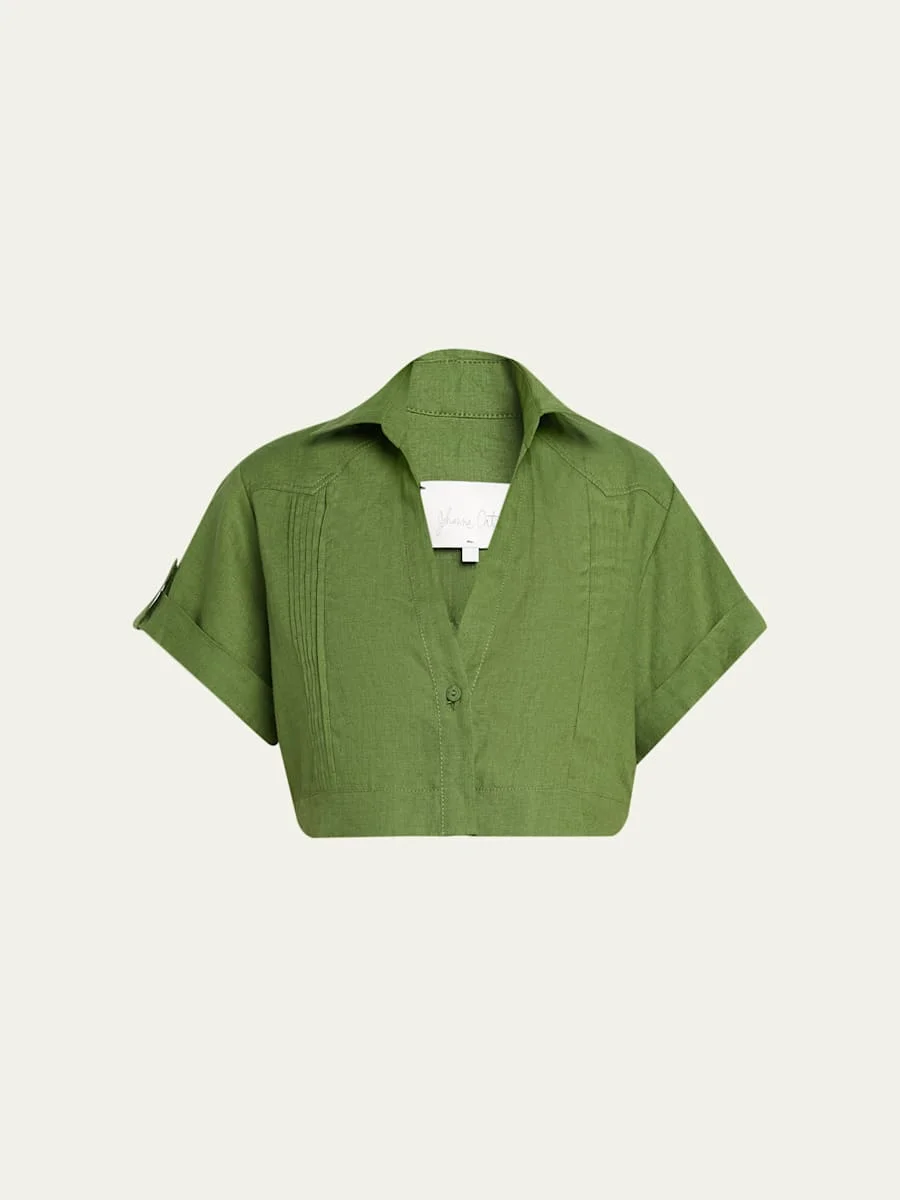 Crafted from lightweight linen, the "Language of the Soul" shirt from Johanna Ortiz is defined by westerninspired shoulder yoked, micro pleats, and rolled cuffs Spread collar; singlebutton front Short sleeves; button roll cuffs Boxy fit Cropped length Buttontab hem Linen Made in Colombia SIZE amp; FITModel measurements: 5'10" tall Model is wearing a US size 4/Small