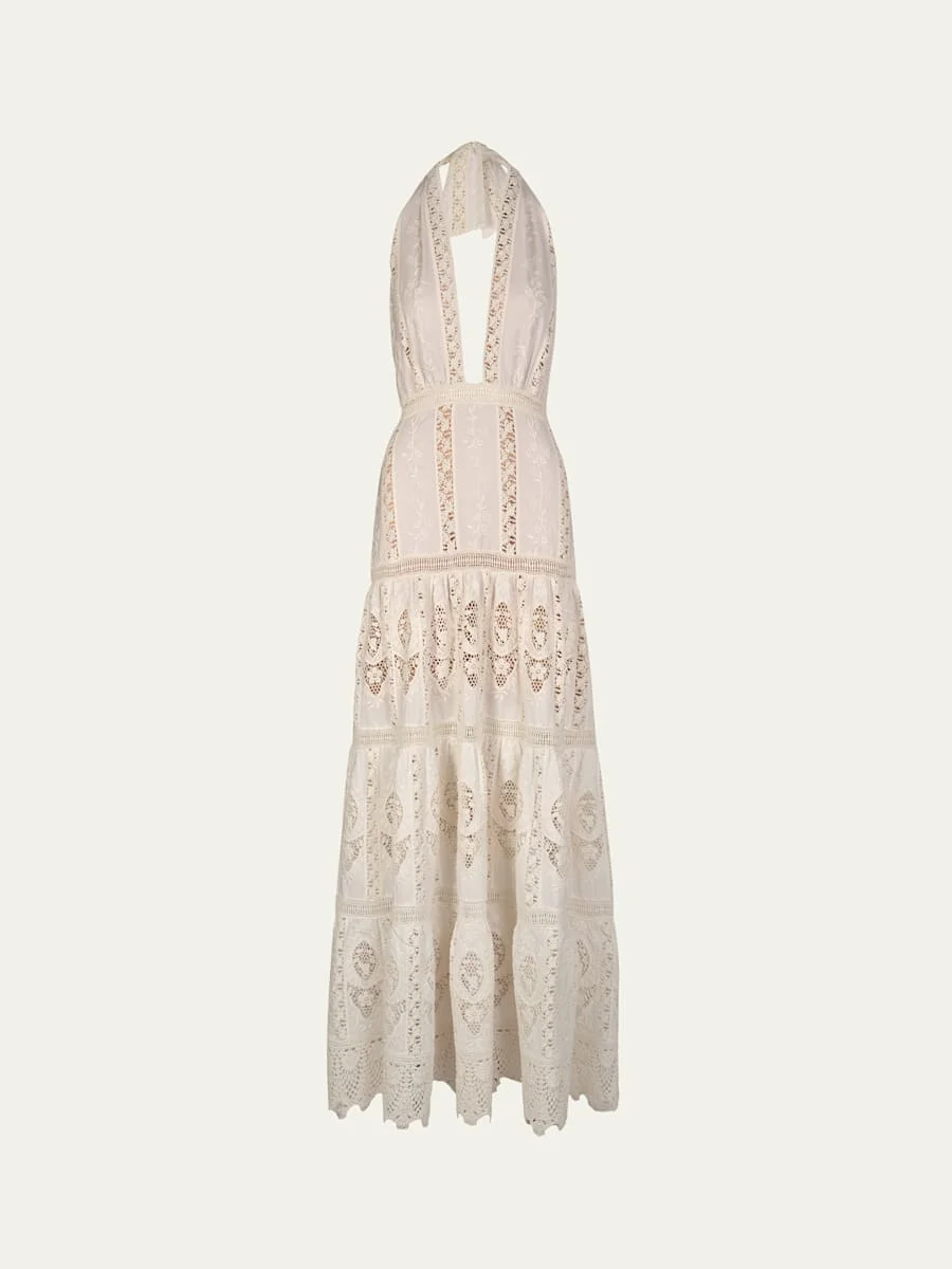 Johanna Ortiz "Luz Tropical" dress featuring lace embroidery and a tiered skirt Approx. 59.5"L from shoulder to hem Plunging halter neckline; self-tie back Sleeveless Full length A-line silhouette Zip closure Polyester Lining: Viscose Dry clean Made in Colombia Online Inquiries: BGS21_BA7YV| Store Inquiries: #5049208