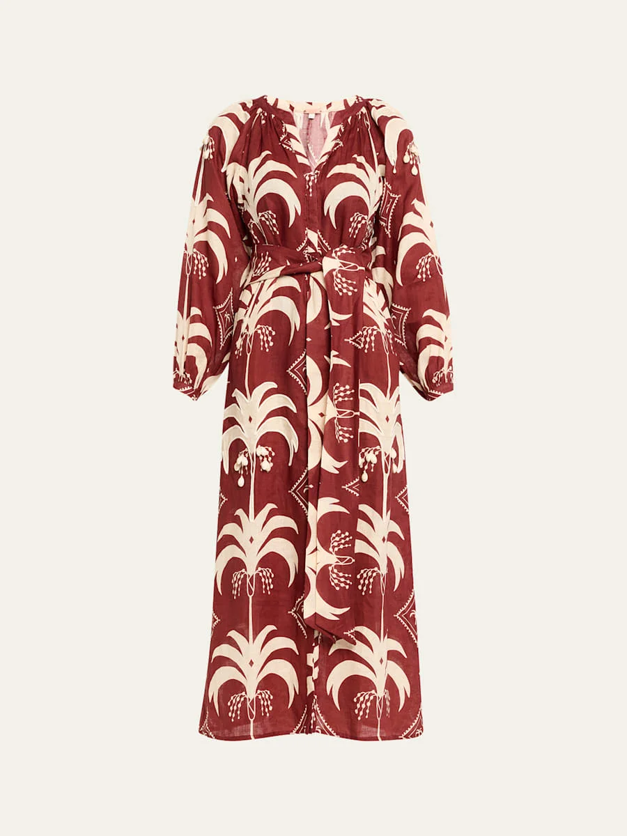 Palm-Print Linen Long-Sleeve Belted Midi Dress