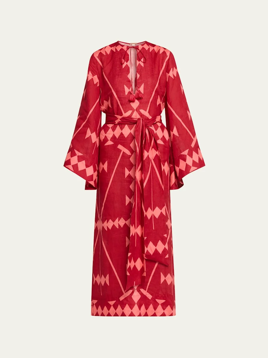 Presented in a geometric pattern, the Savannah tunic dress by Johanna Ortiz is finishes with embroidered tassels V neckline with optional self-ties Wide long sleeves Self-tie sash belt accentuates the waist Hem falls below the knee Relaxed silhouette Linen Made in Colombia Online Inquiries: BGS21_T6P51| Store Inquiries: #5022816