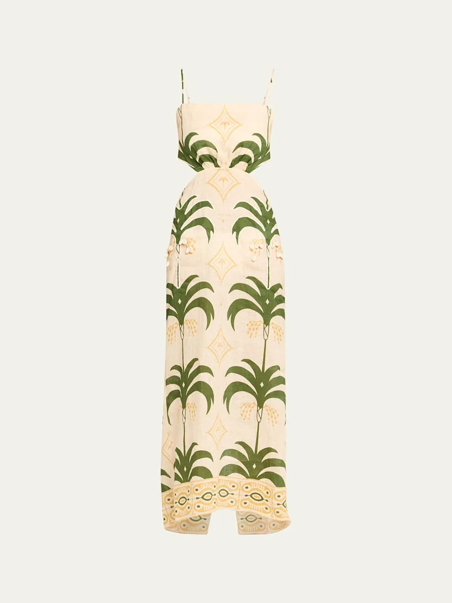 Tactile Winds Embellished Waist-Cutout Linen Midi Dress