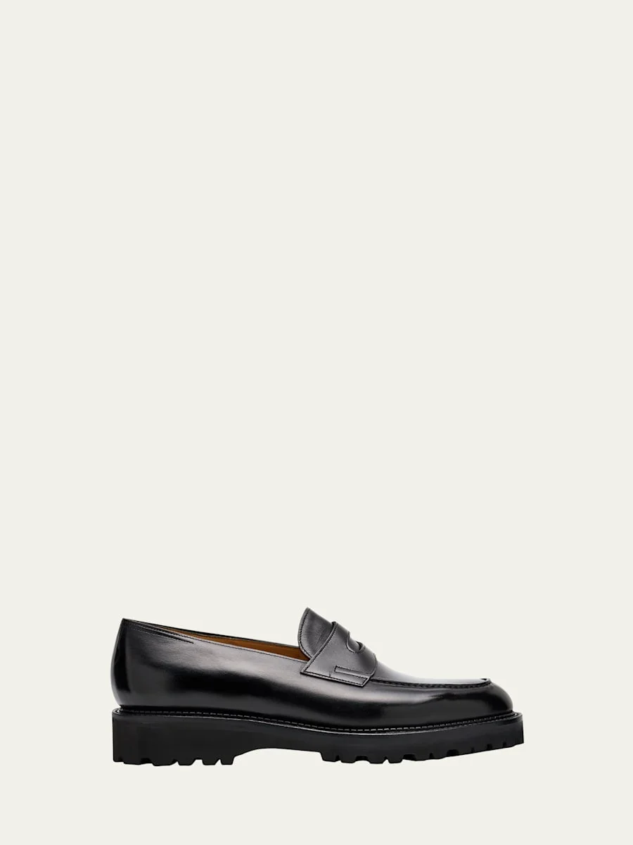 John Lobb "Lopez" penny loafers in shiny calf leather Flat chunky heel Round moc toe Penny keeper strap Leather lining Lugged rubber outsole Slip-on style Imported Online Inquiries: BGS21_NCC4S| Store Inquiries: #4853671
