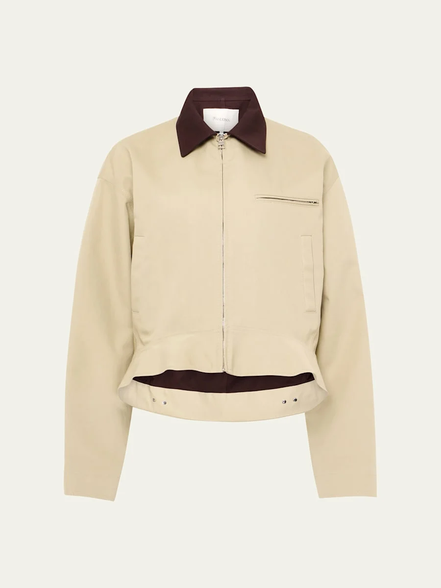 JW Anderson workwear jacket crafted with utilitarian precision, detailed with a contrast collar Spread collar; zip front Long sleeves Relaxed fit Chest zip pocket; side pockets Curved hem Cotton Made in Bulgaria Online Inquiries: BGS21_BA702| Store Inquiries: #5043383