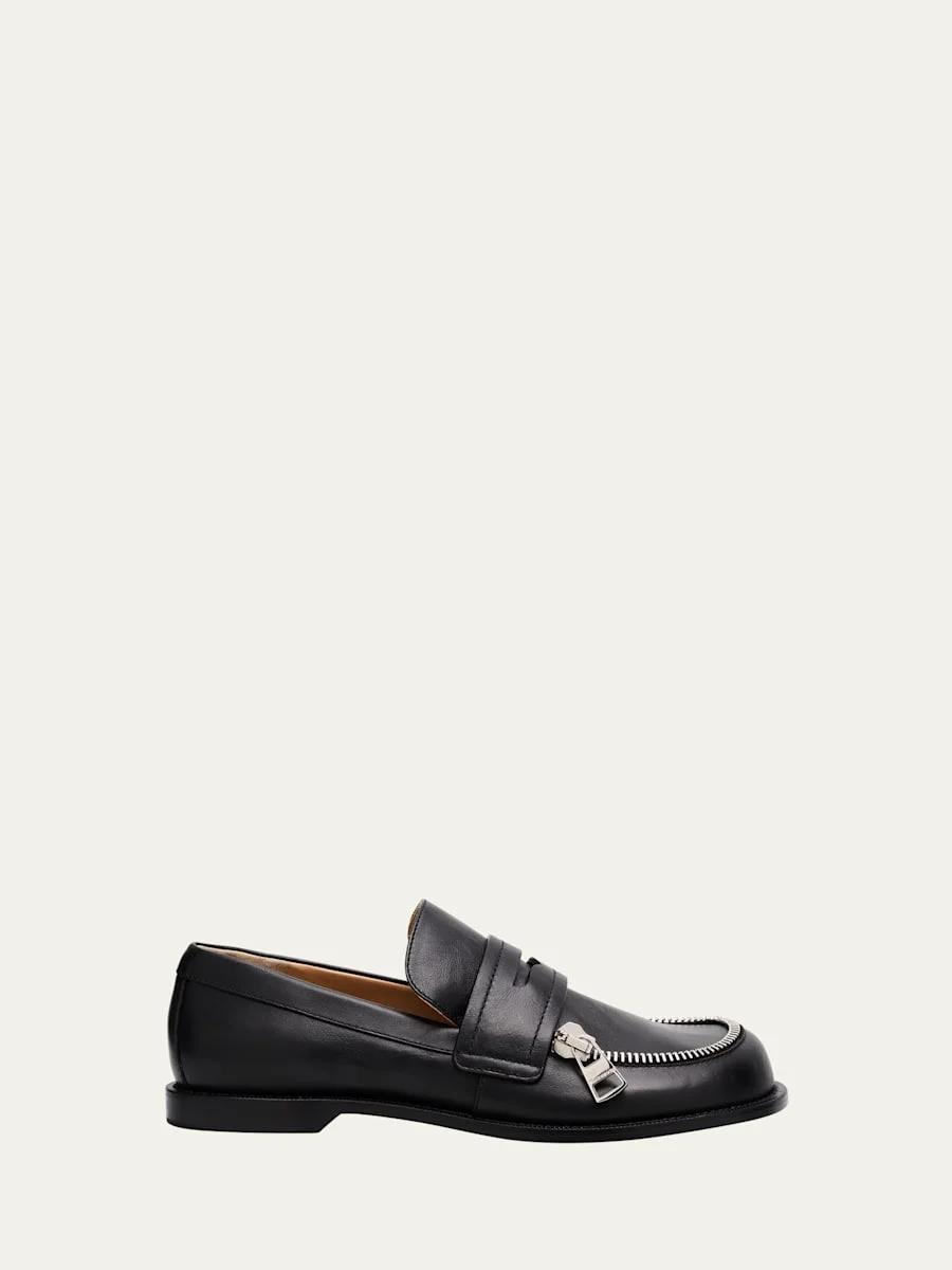 JW Anderson leather loafers finished with a biker-style zipper detail 0.50 in / 15 mm flat heel Round moc toe Notched vamp with keeper strap Slip-on style Leather outsole Lining: Leather Made in Italy Online Inquiries: BGS21_X6XYF| Store Inquiries: #5045689