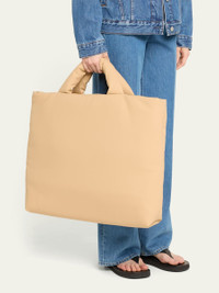 Kassl tote bag in padded signature rubber-shelled polyester and faux leather (polyurethane) Top handles Shoulder strap Can be worn as a top handle or shoulder bag Open top Interior, fits a 13-inch laptop or larger Lining: Polyester Approx. 21.6"H x 17.7"W x 3.1"D Wipe clean Made in Poland Online Inquiries: BGS21_V673L| Store Inquiries: #4783140