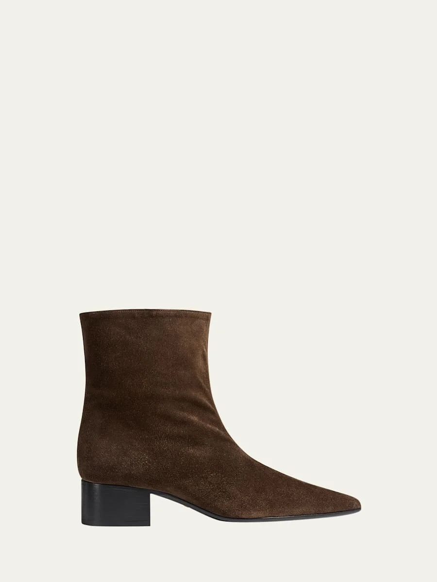 Rendered in velvety calf suede with a contrasting sole, the "Andee" ankle boots by Khaite offer a timeless design with endless versatility 1.75 in / 45 mm stacked block heel Pointed toe Pull-on style Leather lining and outsole Made in Italy Online Inquiries: BGS21_X7CWA| Store Inquiries: #5414130