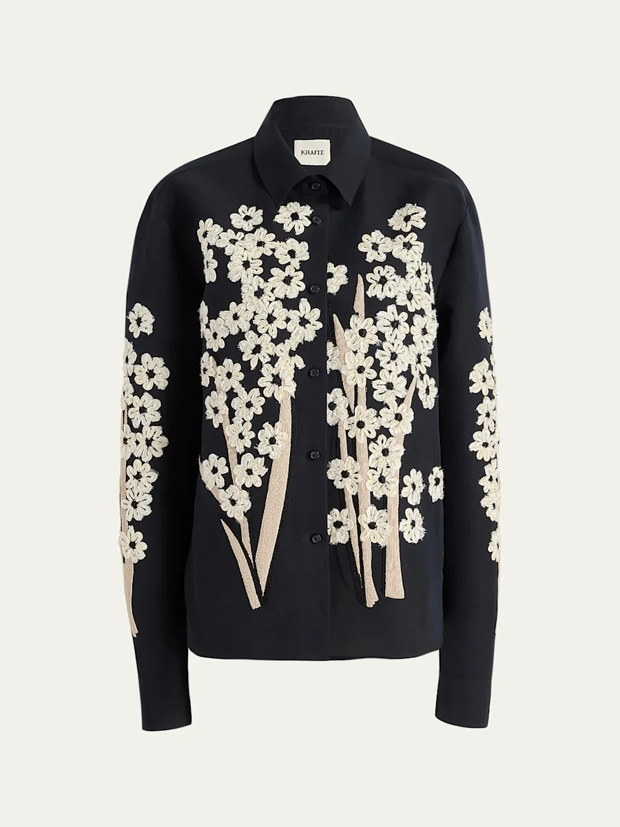 This "Argo" top from Khaite features contrast floral applique blooming on the front and sleeves Point collar; button front Drop shoulders Long sleeves Button cuffs Back yoke Relaxed fit Silk/cotton Dry clean Made in the USA