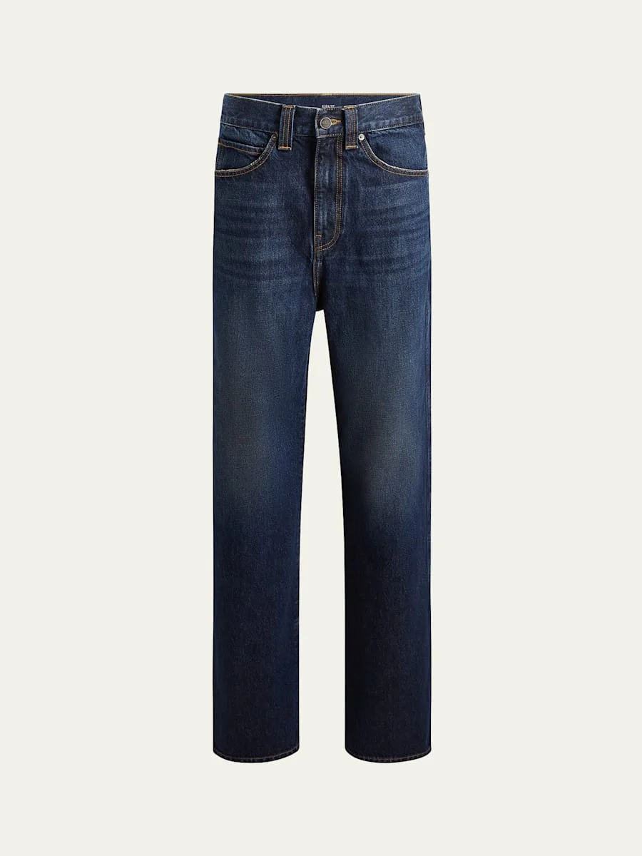 Khaite "Bonnie" dark wash jeans fetauring slight fading and whiskering Midrise sits high on hip Fivepocket style Straight legs Full length Button/zip fly; belt loops Cotton Dry clean Made in USA