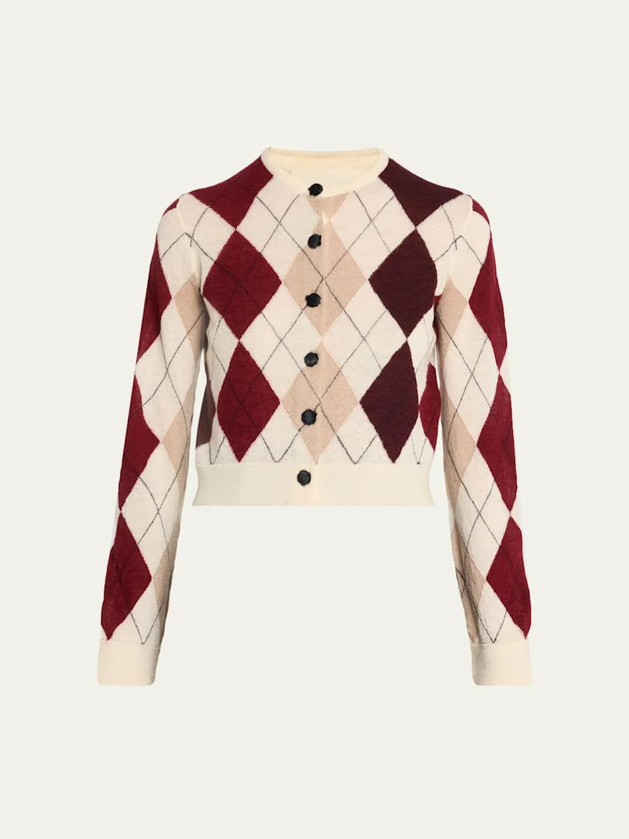Khaite "Charli" argyle cardigan crafted in a supersoft cashmere and wool blend Crew neckline Long sleeves Fitted Hem sits a the hip Buttonfront Cashmere/mohair Dry clean Made in Italy
