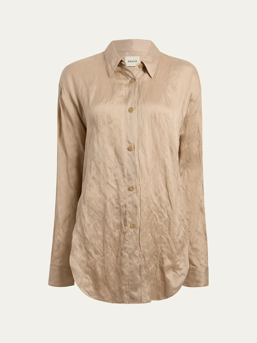 Khaite "Goya" top is crafted of crinkled satin featuring side slits Point collar; button front Long sleeves; button cuffs Yoked back Loose fit Hem falls below the hip Shirttail hem with side slits Viscose/nylon/polyamide/elastane Made in USA