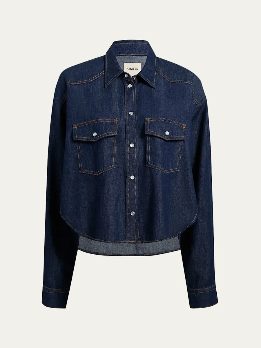 Khaite "Grenon" western top is crafted from a darkwash denim featuring front V yokes with contrast topstitching Point collar; snap button front Long sleeves; button cuffs V yoke back Chest snapflap pockets Loose fit Shirttail hem Cotton Made in USA