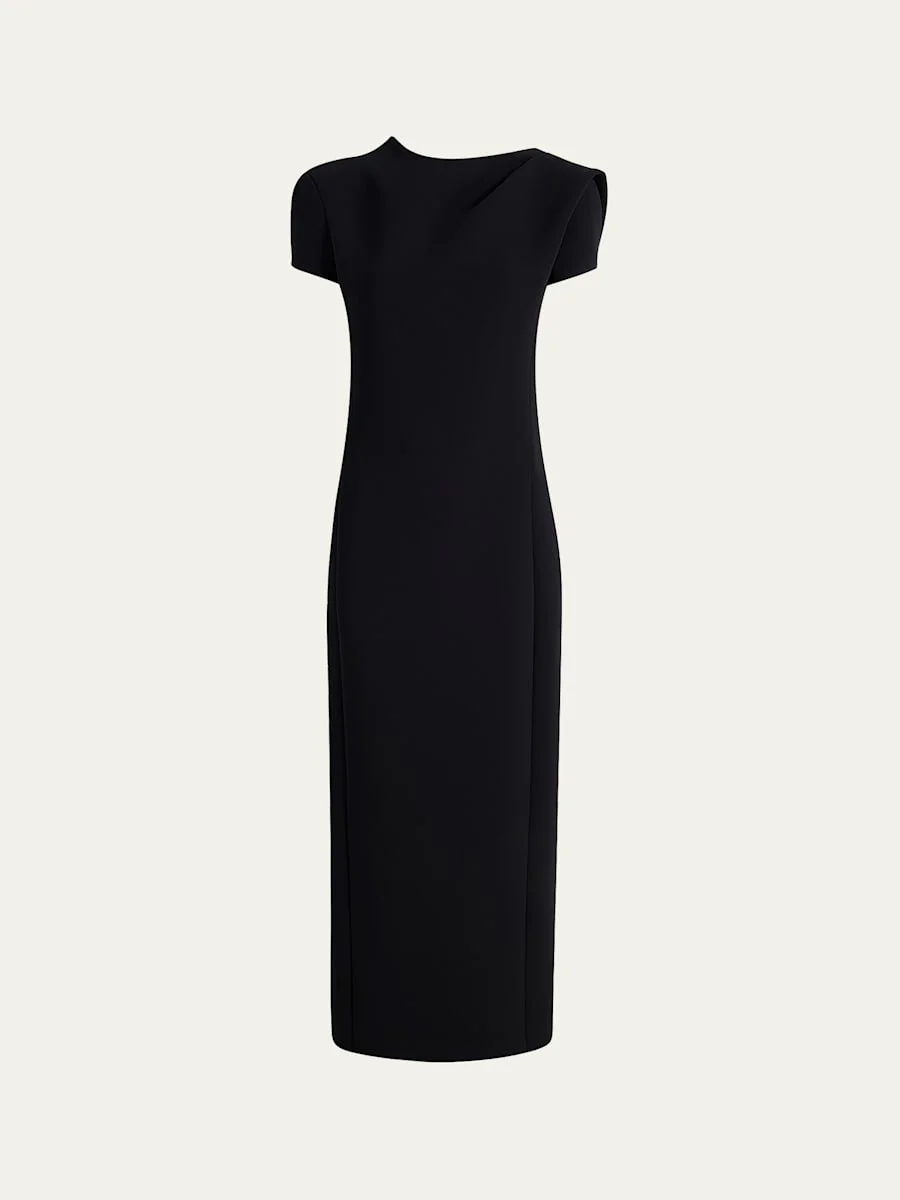 This "Iryl" midi dress from Khaite showcases a lowcut back with a cowl drape, detailed with a gathering on the shoulder High neckline Short sleeves Draped, lowcut back Hem falls below the knee Column silhouette Polyester Dry clean Made in the USA