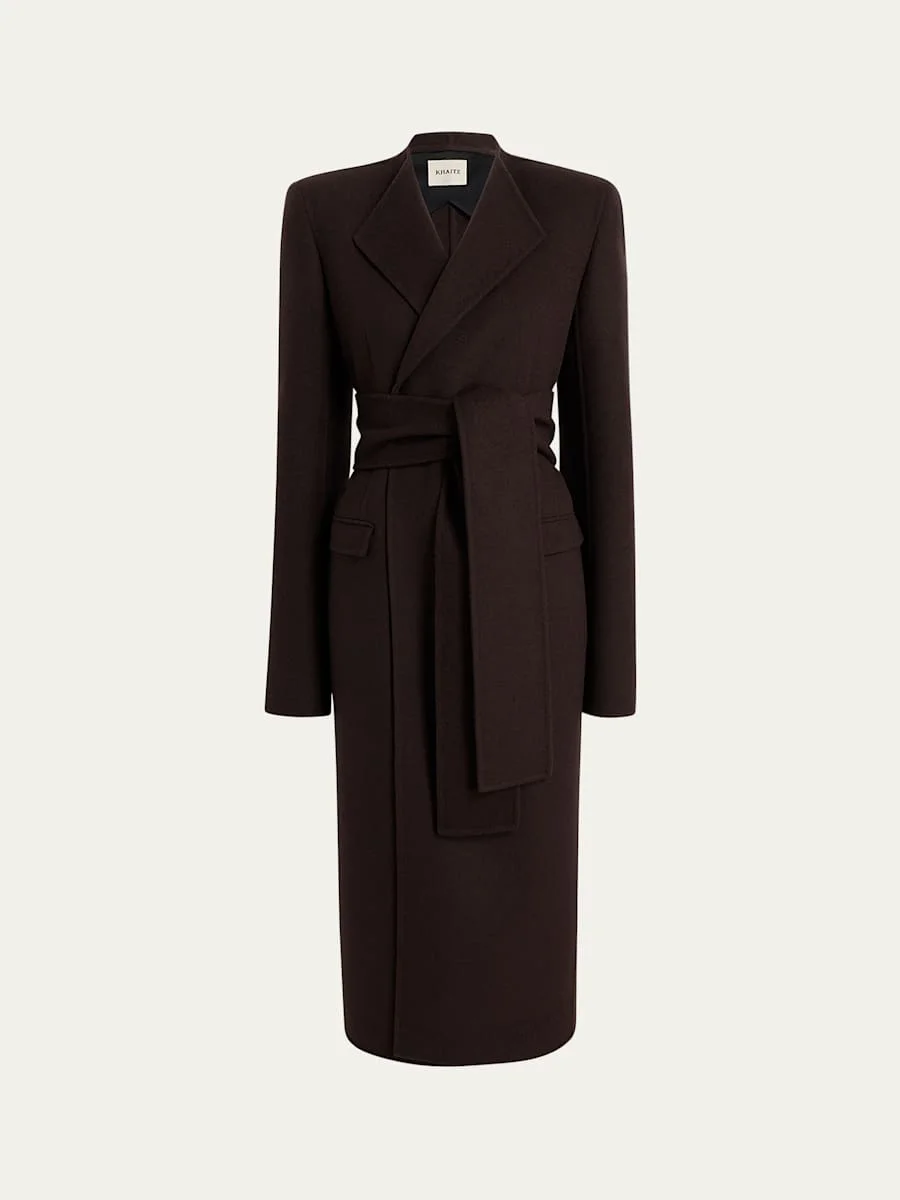 The "Jelson" coat from Khaite is crafted in double-faced wool, finished with clean lines and a detachable waist self-tie for a customizable fit Upper body lined with cupro twill Stand collar; wrap front Long sleeves Front flap pockets Hem falls below the knee Straight silhouette Wool Dry clean Made in Italy Online Inquiries: BGS21_BARUT| Store Inquiries: #5246141