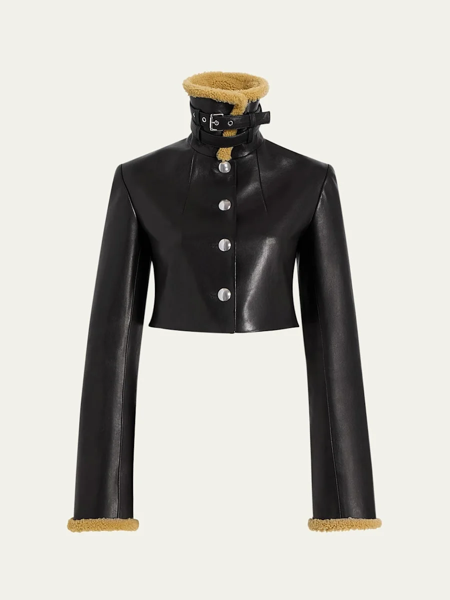 Crafted in smooth leather, the "Jodie" jacket from Khaite is detailed with dyed shearling (United States) trim and an adjustable belt strap on the collar. Vertical darts and metallic buttons add a refined finish. Stand collar Button front Long sleeves Button cuffs Cropped style Slim fit Leather/shearling Dry clean Made in the USA Online Inquiries: BGS21_BAZFB| Store Inquiries: #5357000