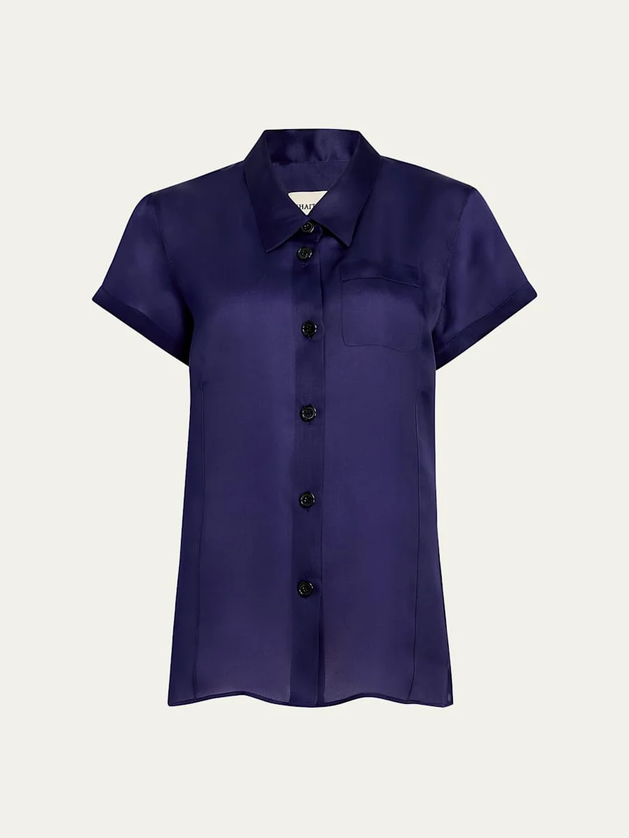 Khaite "Keefe" satin top Spread collar; button front Short sleeves Chest patch pocket Relaxed fit Silk Dry clean Made in Italy Online Inquiries: BGS21_B9VBV| Store Inquiries: #4981472