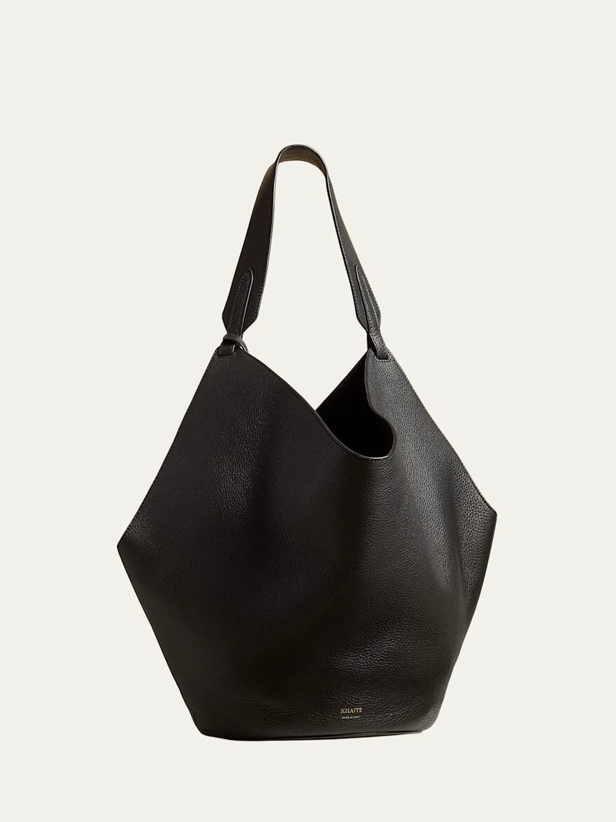 Khaite "Lotus" tote bag in pebbled sport calfskin leather Shoulder strap Open top with magnetic closure Interior, removable zip pouch bag Approx. 15.5"H x 22"W x 8.5"D Made in Italy Online Inquiries: BGS21_V68XG| Store Inquiries: #4821108