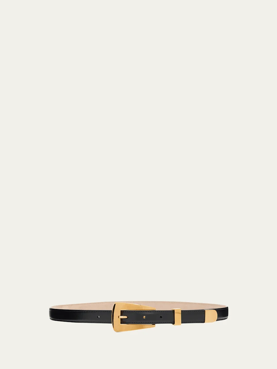 Khaite "Lucca" sleek calfskin belt finished with an elongated trapezoidal buckle. Polished goldplated brass hardware Buckle closure Clean professionally by a leather expert Made in Italy
