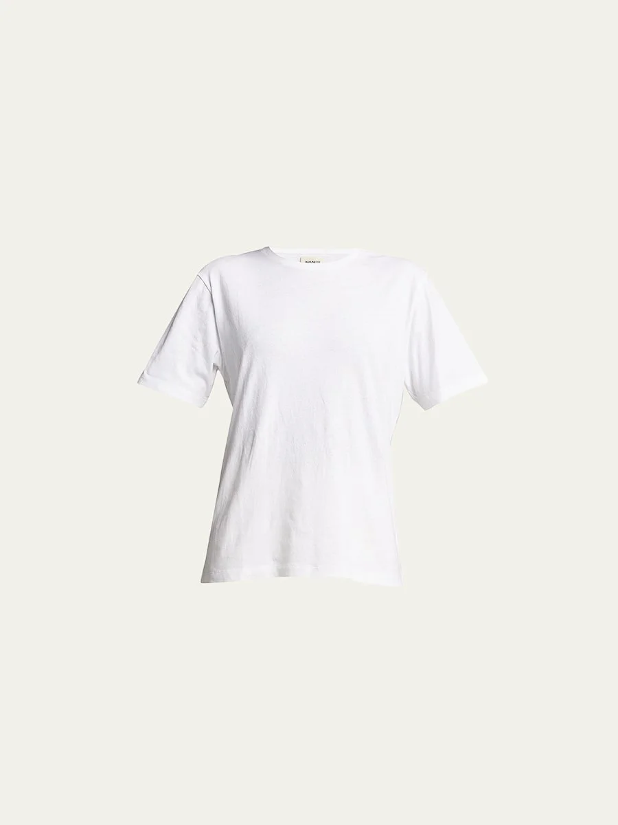 Khaite "Mae" T-shirt with logo patch back Crew neckline Short sleeves Relaxed fit Pullover style Cotton Imported Model is 5'10"/177cm. Online Inquiries: BGS21_B6TDX| Store Inquiries: #4188618