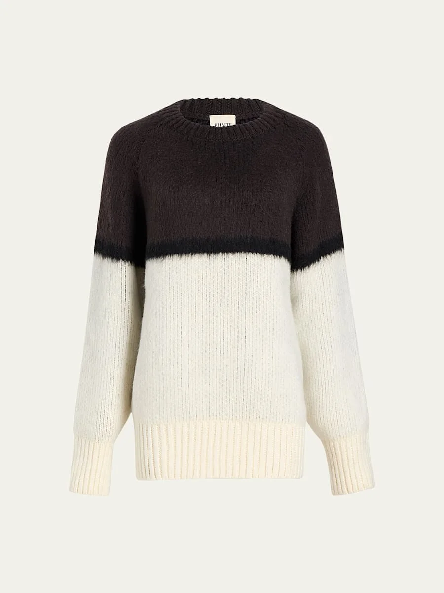 Khaite "Martina" colorblock knit sweater Crew neckline Long sleeves Relaxed fit Pullover style Cashmere/mohair Made in Italy Model is 5'10"/177cm. Online Inquiries: BGS21_B9KV4| Store Inquiries: #4896179