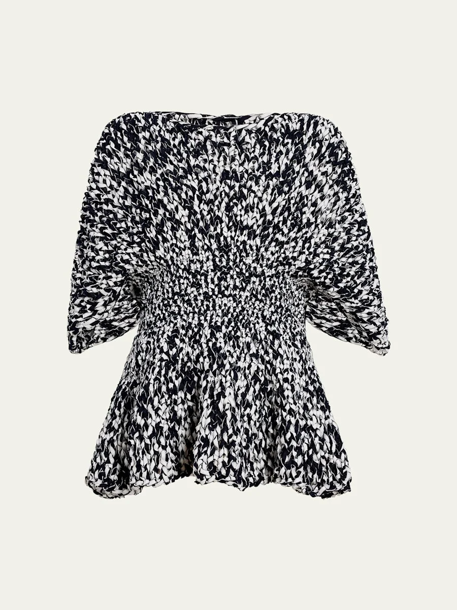 Khaite "Mathilde" knit top spun with a boucle effect Bateau neckline Short subtle batwing sleeves Cinched waist Peplum hem Pullover style Cotton Dry clean Made in USA Online Inquiries: BGS21_B9VE3| Store Inquiries: #4981826