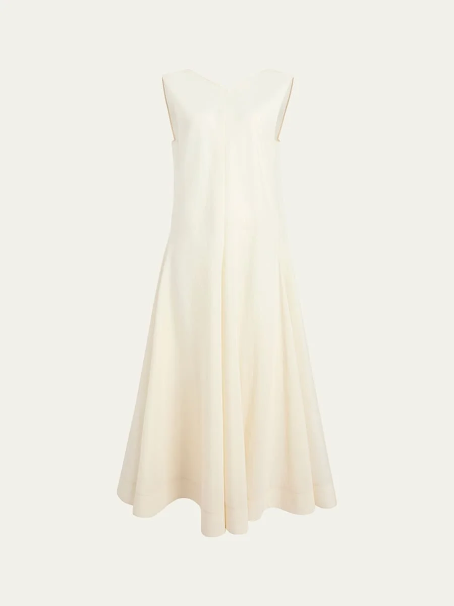 Khaite "Mellie" dress featuring a low V back V neckline Sleeveless Full length A-line silhouette Slipover style Silk/cotton Dry clean Made in USA Online Inquiries: BGS21_B9XAQ| Store Inquiries: #4992815