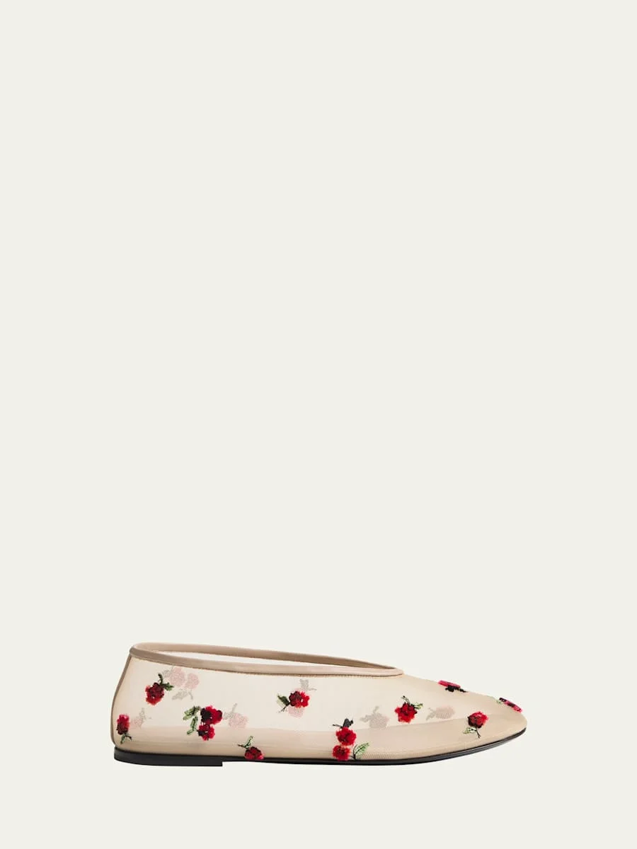 Khaite "Marcy" ballerina flat in sheer mesh fabric featuring raspberry-embroidered accents for a delightful finish 0.17 in / 5 mm flat heel Round toe Tonal banded topline Slip-on style Leather outsole Made in Italy Online Inquiries: BGS21_X6VVZ| Store Inquiries: #5008652