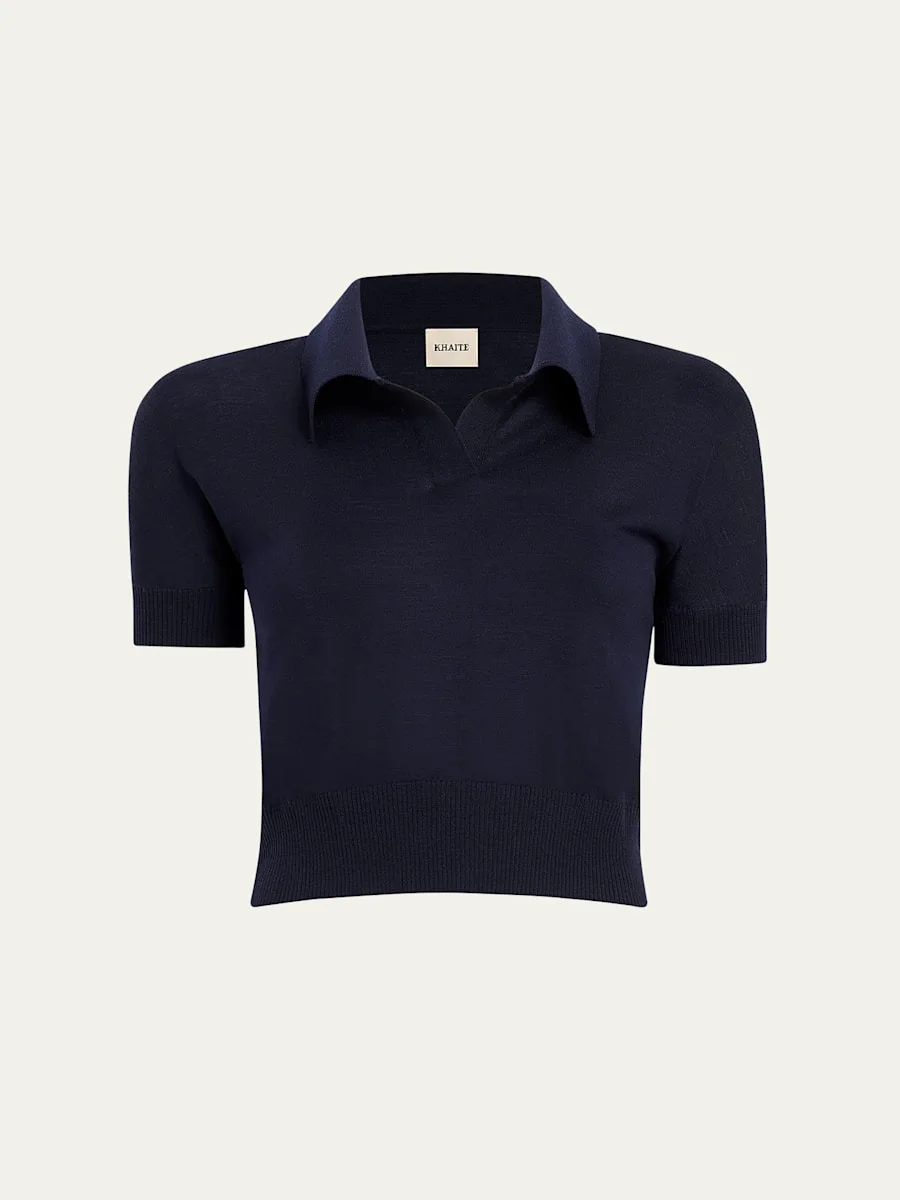 Khaite "Morgane" polo top Spread collar; split V front Short sleeves Relaxed fit Cropped length Ribbed cuffs and hem Pullover style Wool/nylon/polyamide Dry clean Made in Italy Model is 5'10"/177cm. Online Inquiries: BGS21_B9NEP| Store Inquiries: #4924556