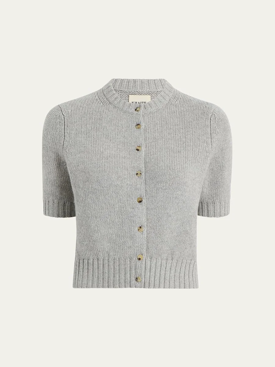 Khaite "Nora" knit button-front cardigan in cashmere Crew neckline Short sleeves Ribbed trim Cashmere Hip length Relaxed fit Dry clean Imported Model is 5'10"/177cm. Online Inquiries: BGS21_B9ALU| Store Inquiries: #4824196