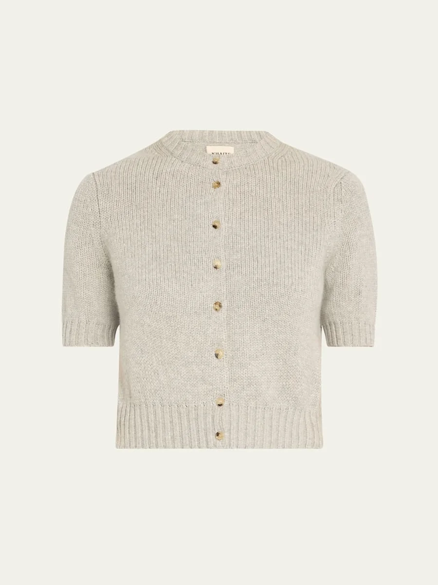 Khaite "Nora" knit buttonfront cardigan in cashmere Crew neckline Short sleeves Ribbed trim Cashmere Hip length Relaxed fit Dry clean Imported