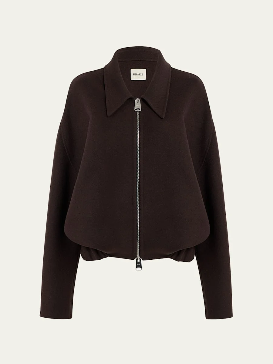Crafted in double-faced wool, the "Odin" jacket from Khaite features a stripped-down bomber silhouette designed in an oversized fit for comfortable wear Point collar Two-way zip front Drop shoulders Long sleeves On-seam pockets Elasticized hem Oversized fit Wool Dry clean Made in Italy Online Inquiries: BGS21_BAJXF| Store Inquiries: #5170451