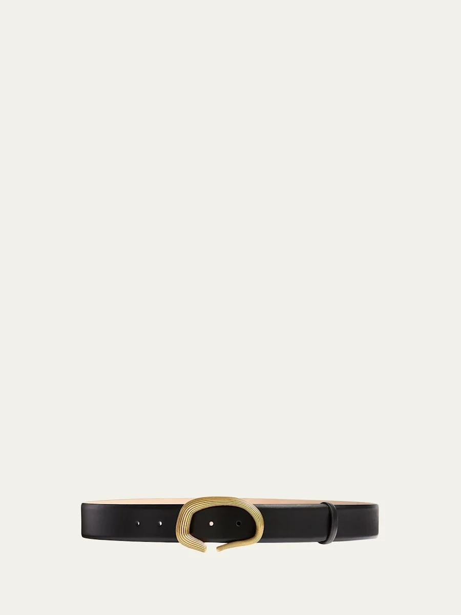 The Khaite "Santa Fe" belt in smooth leather features a sculptural goldtone metal buckle. Single keeper strap Adjustable fit Buckle closure Cut to size Leather Made in Italy
