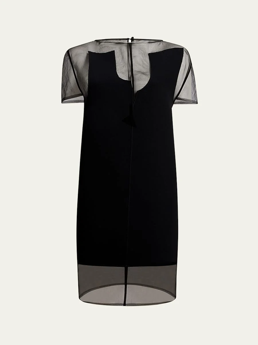 Khaite "Winona" paneled dress with a sheer neckline Boat neckline; button/open-back Short sleeves Mini length Shift silhouette Polyester Dry clean Made in Italy Online Inquiries: BGS21_B9VBT| Store Inquiries: #4981470