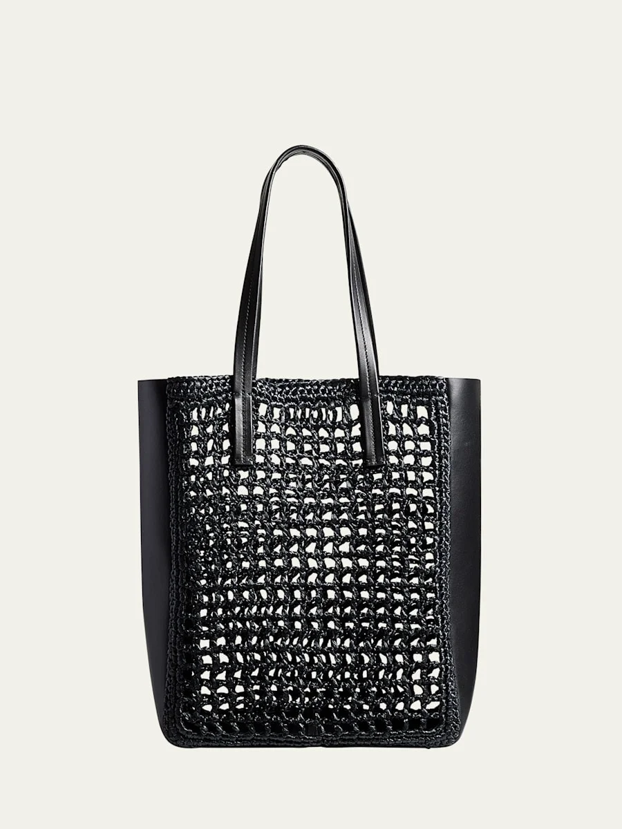 Khaite "Zoe" north-south tote bag in raffia-like fabric and leather Shoulder straps Open top Approx. 12.5"H x 14"W x 4.6"D Viscose Professional cleaning recommended Made in Italy Online Inquiries: BGS21_V6KWT| Store Inquiries: #5032800