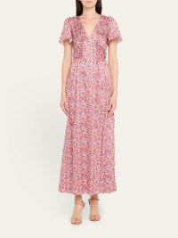 Kika Vargas "Lara" dot-printed satin dress Approx. 52.7"L from shoulder to hem V neckline Short sleeves Full length Body-skimming silhouette Invisible back zipper Polyester/elastane Lining: Elastane/polyester/satin Made in Colombia Online Inquiries: BGS21_T6REL| Store Inquiries: #5025576