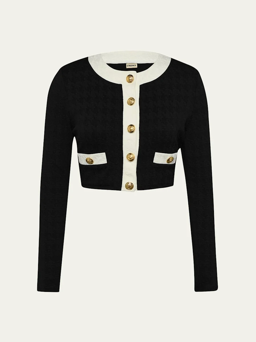 L'Agence "Adaline" colorblock chic cardigan decorated with golden embossed-dome buttons Can be worn with coordinating swimsuits for a chic vacation look Crew neckline; button front Long sleeves Cropped hem Slim fit Nylon/polyamide/elastane Imported Model is 5'10"/177cm. Online Inquiries: BGS21_T6ZNJ| Store Inquiries: #4917073