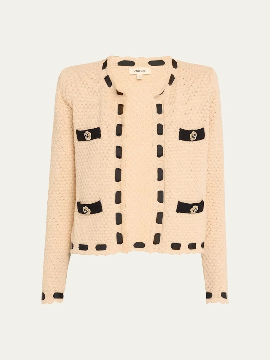 L'Agence "Astor" knit cardigan featuring contrast trim with scalloped detailing Round neckline Long sleeves Faux pockets Classic fit Open front Cotton/Amni® nylon/wool Made in USA Online Inquiries: BGS21_T61RM| Store Inquiries: #4884274