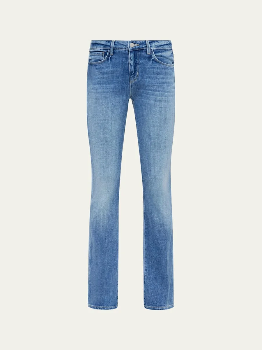 L'Agence "Cara" bootcut jeans in faded mediumwash denim Approx. 8.5" rise; 33" inseam Lowrise; sits at the hip Fivepocket style Fitted through the hip and thigh Full length Button/zip fly; belt loops Cotton/polyester/spandex Made in USA