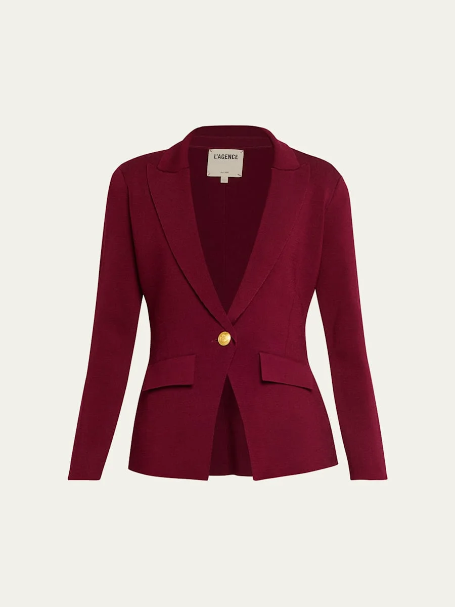L'Agence "Chamberlain" knit blazer finished with golden embossed-dome buttons Peak lapels; single-button front Long sleeves; button cuffs Hip flap pockets Mid-length Slim fit Rayon/cellulose acetate/nylon/polyamide/spandex Dry clean Imported Model is 5'10"/177cm. Online Inquiries: BGS21_T8Y1B| Store Inquiries: #4852863