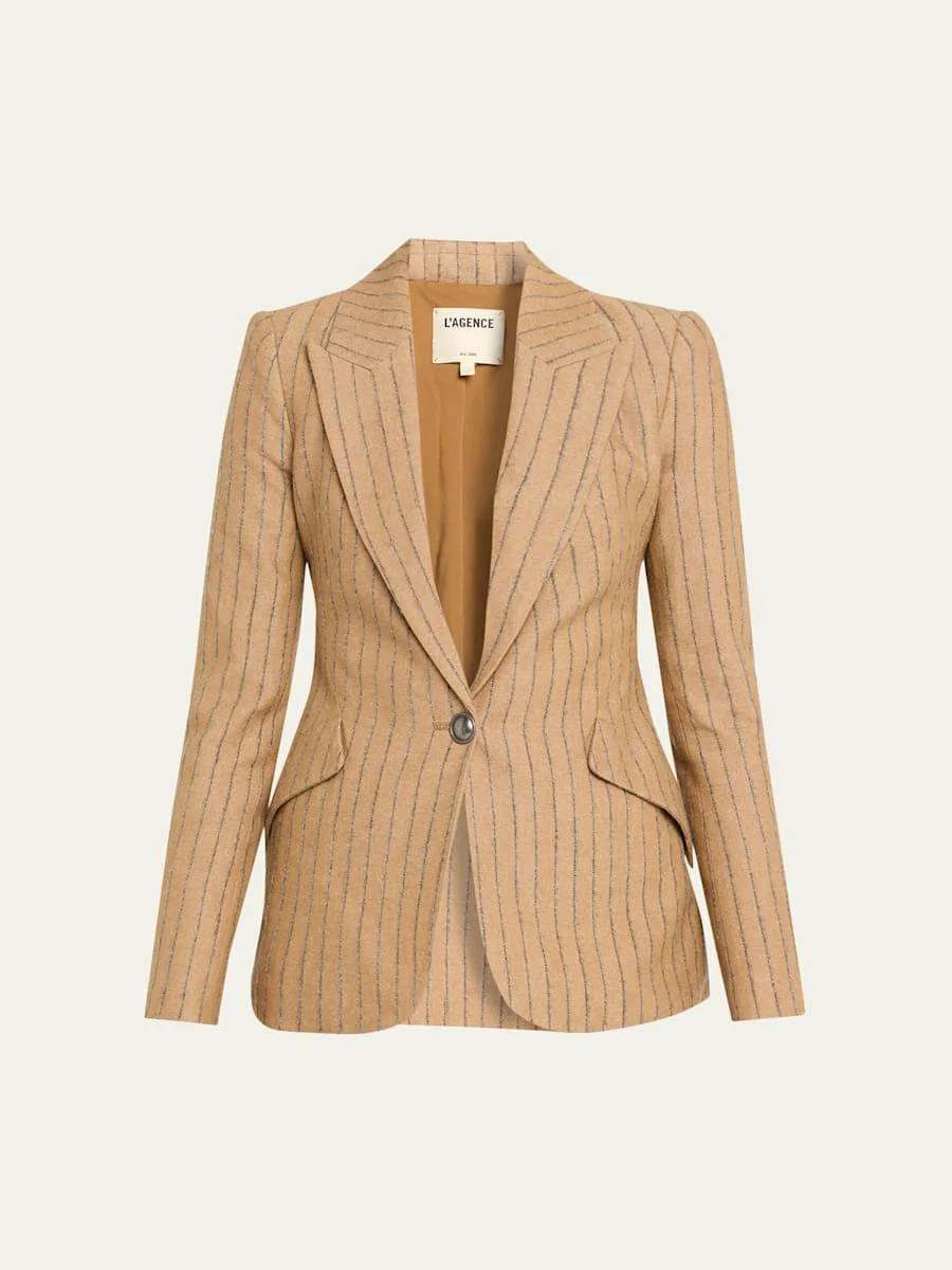 Crafted from a classic textured suiting fabric, the "Chamberlain" blazer by L'Agence features vertical pinstripes for a figure-lengthening effect Approx. 27.5"L from shoulder to hem Peal lapels; single-breasted front Padded shoulders Long sleeves; button cuffs Angled hip flap pockets Double-vented back Tailored fit Viscose/polyester/cotton Imported Online Inquiries: BGS21_T8S78| Store Inquiries: #5387541