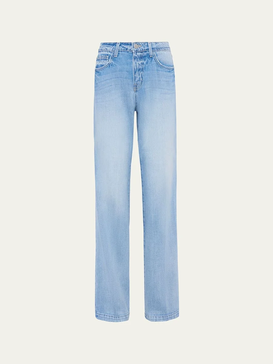 L'Agence "Clayton" wide-leg jeans in dark-wash denim Approx. 10" rise; 35" inseam High rise Five-pocket style Easy fit Full length Button/zip fly; belt loops Cotton/polyester/spandex Made in USA Online Inquiries: BGS21_T65C2| Store Inquiries: #4885515
