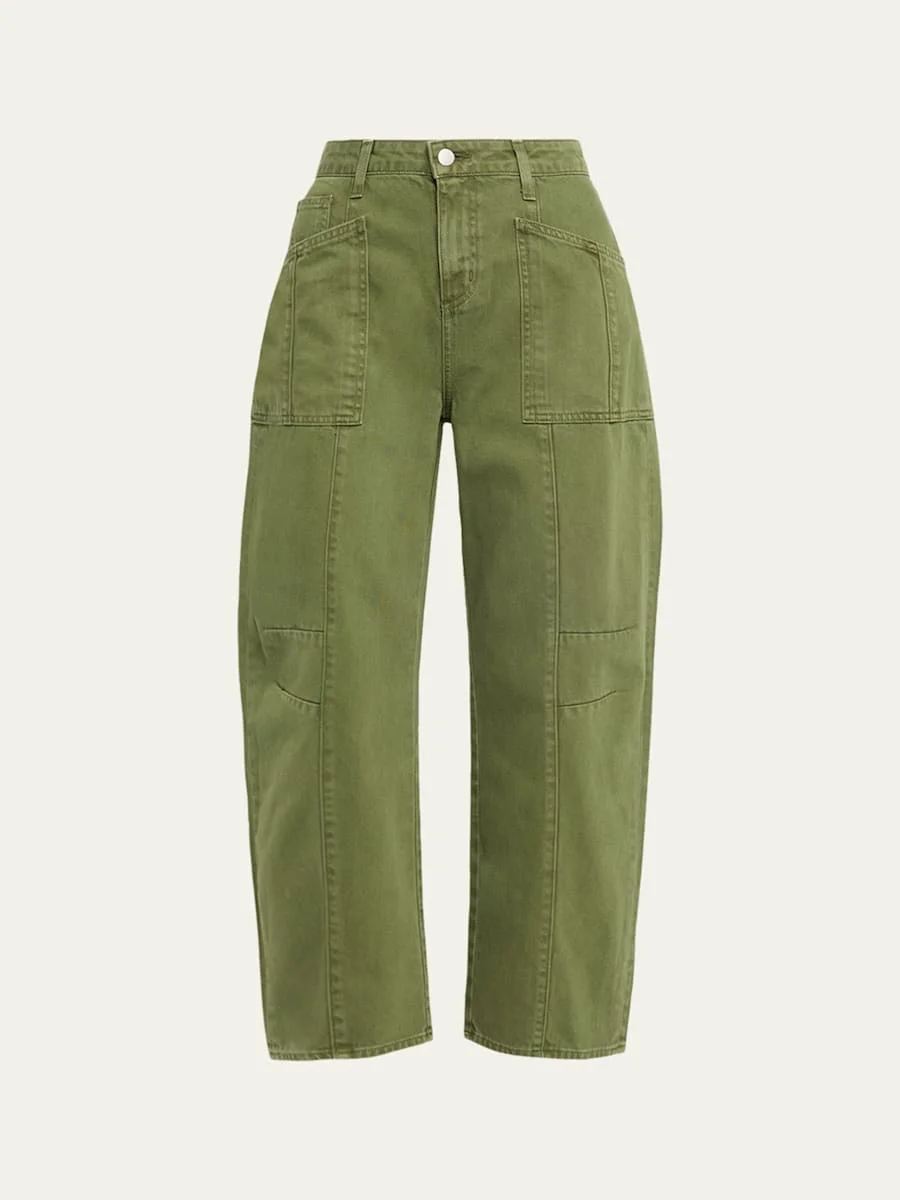 L'Agence "Cody" rodeo jeans in white denim Approx. 11" rise; 26" inseam High rise Five-pocket style Loose, curved legs Cropped length Button/zip fly; belt loops Cotton Made in USA Online Inquiries: BGS21_T6LAE| Store Inquiries: #5002296