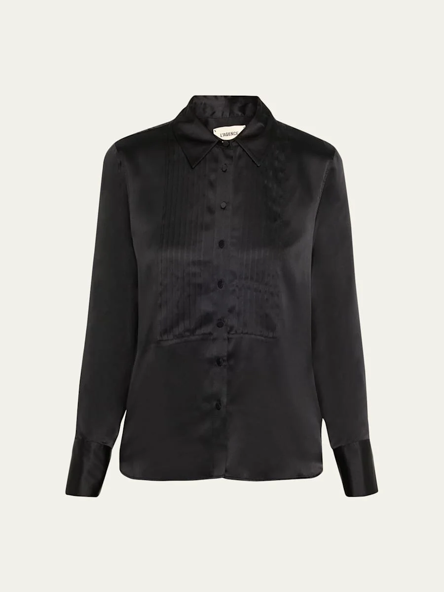 L'Agence "Divya" lustrous silk tux shirt with a front pintuck bib panel Spread collar; button front Long sleeves; button cuffs Yoked back Hip length Relaxed fit Silk Dry clean Imported Online Inquiries: BGS21_T64NK| Store Inquiries: #4901454